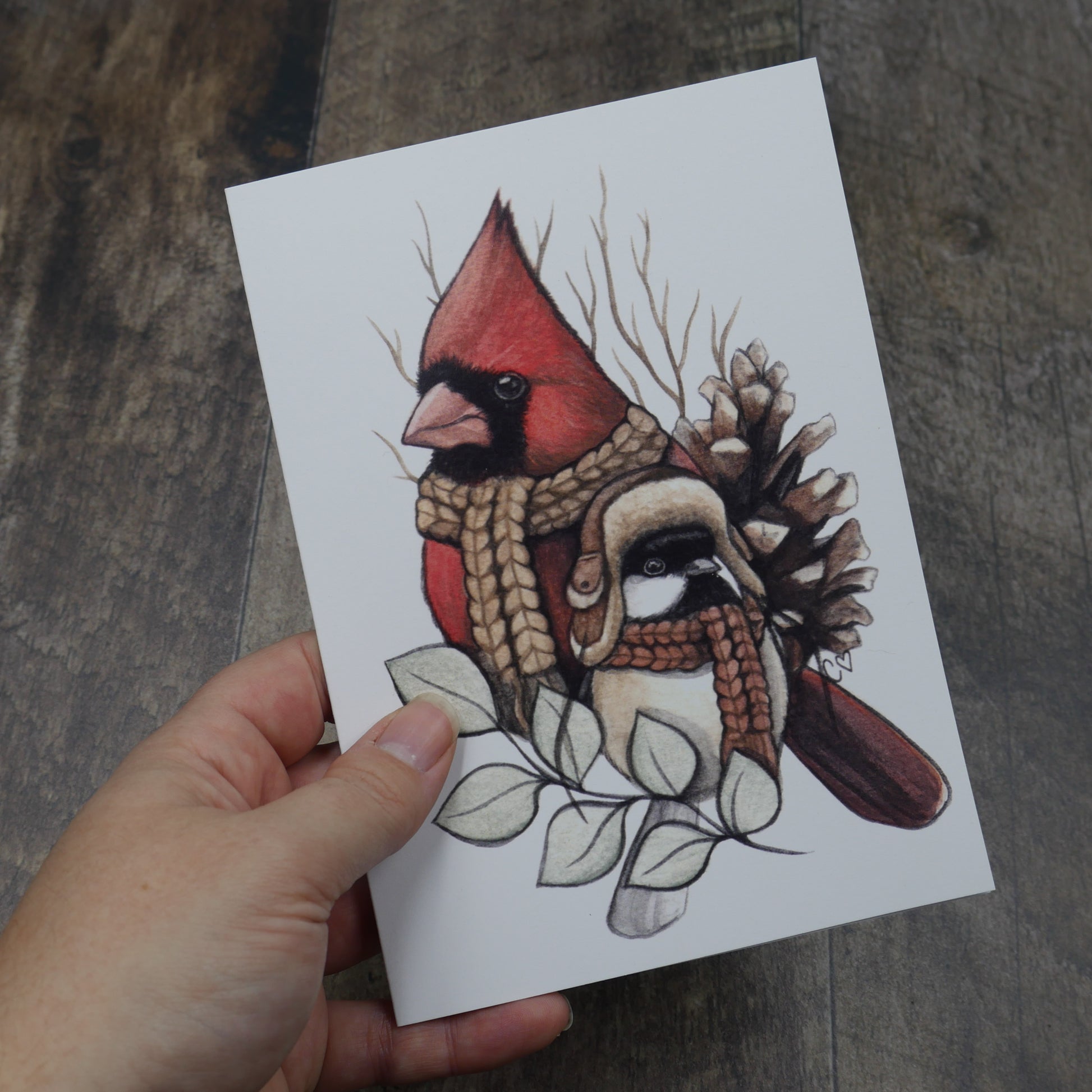 Elle représente un cardinal rouge accompagné d'une mésange à tête noire qui porte un chapeau aviateur.