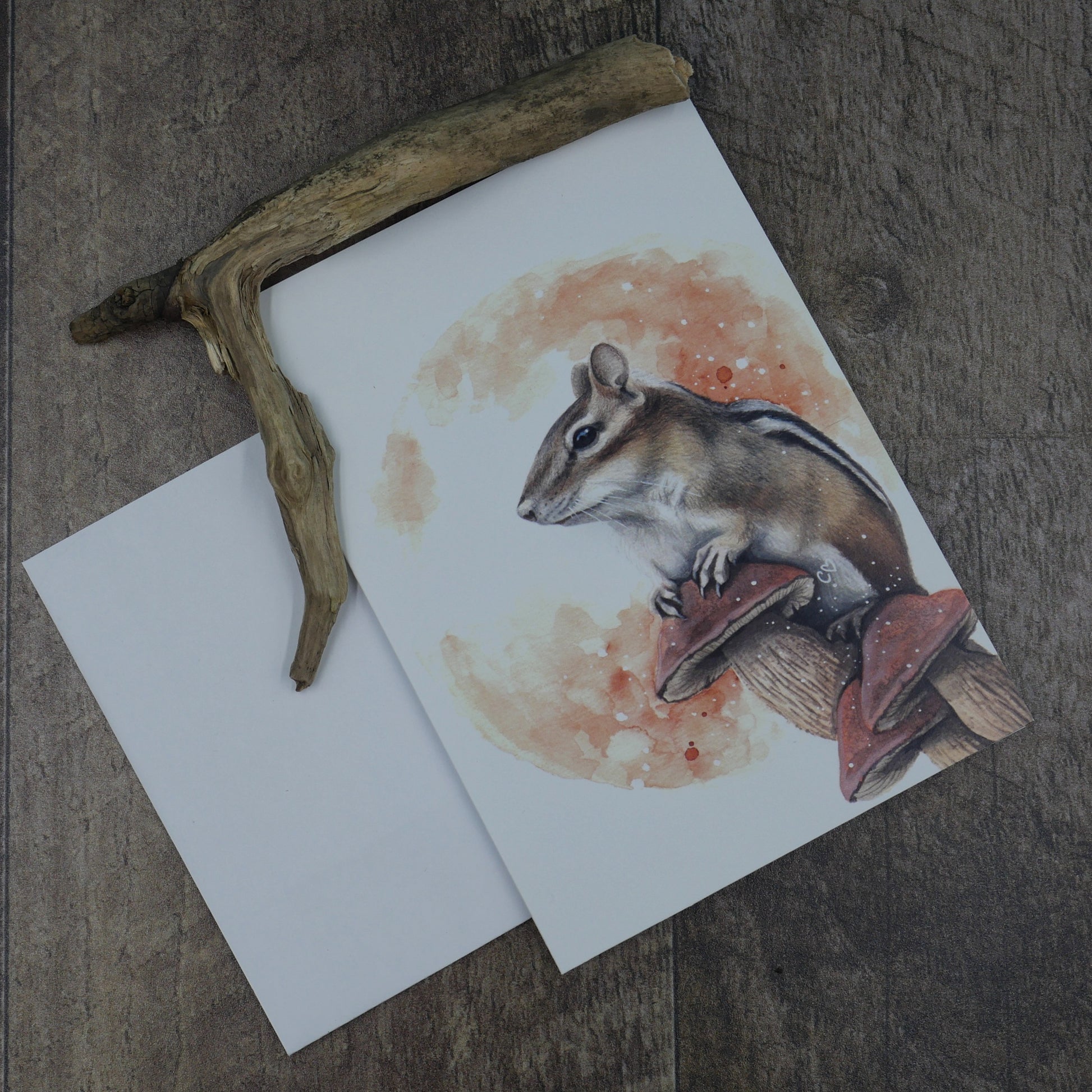 Elle représente un mignon tamia rayé de tenant sur des champignons.