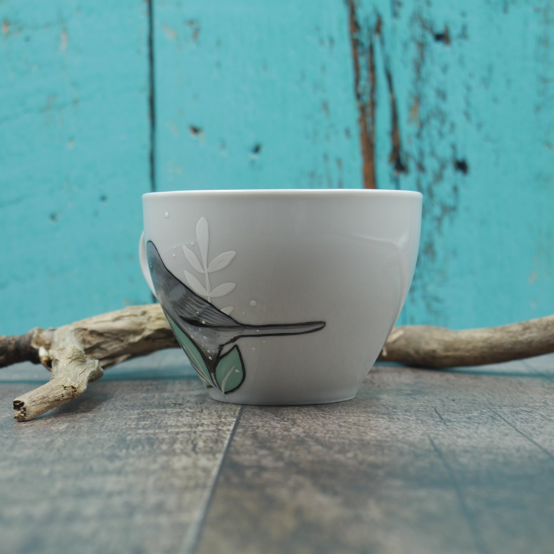 Cette œuvre a été peinte sur une tasse recyclée, tasses que je déniche dans les boutiques secondes mains. Cette démarche m'offre le bonheur de donner une deuxième vie aux pièces inutilisées.