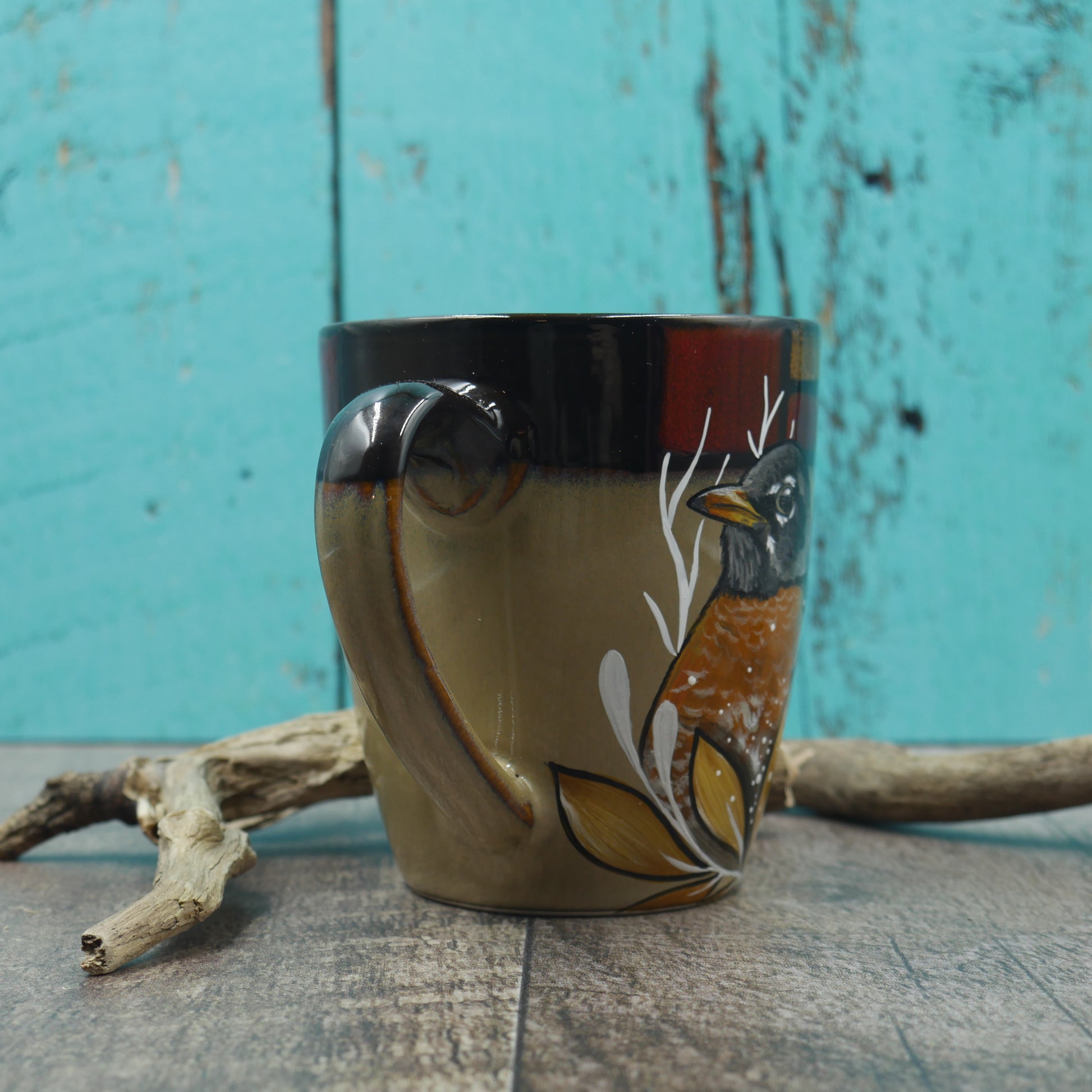 Elle représente un joli merle d'Amérique entouré de feuillage.